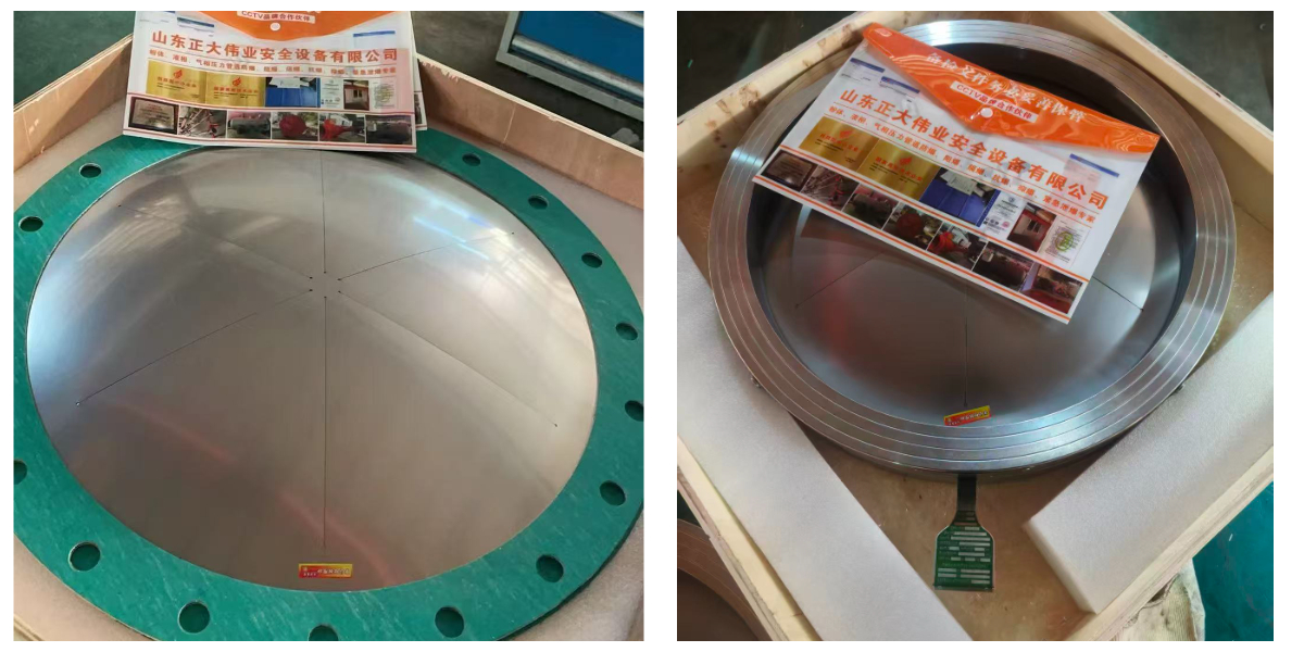 The most commonly requested sizes from DN25 (1") to DN150 (6") are typically available from stock. Standard burst pressures include 2, 4, 6, 8, 10 barg, etc., within the overall range. Holders are carbon steel with a corrosion-resistant paint finish. The bursting membrane is 304 or 316 stainless steel. Standard burst tolerance is ±5%. Gaskets are typically graphite or PTFE for general service. Flange ratings are ANSI 150# or PN16.